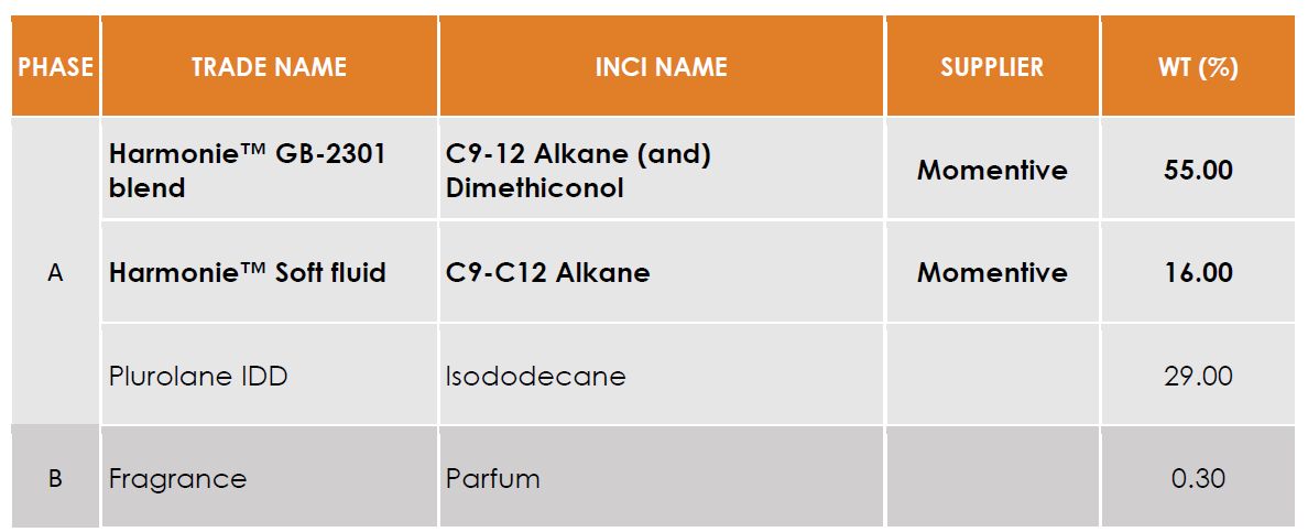 Light Hair Elixir offers the most conditioning solution with 55% of HarmonieTM GB-2301 blend. A higher viscosity is achieved signaling the higher level of conditioning performance, suitable for dry and damaged hair. Formula costs are balanced by introducing Isododecane into the solvent mix which also increases the level of volatility.